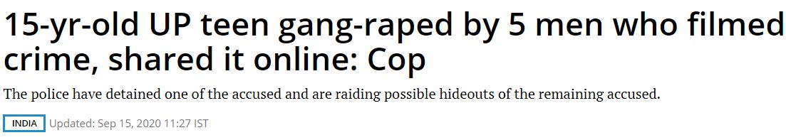 印度北方邦锡达布尔上周发生一起15岁女孩被5名男子轮姦的恶性事件,嫌犯还录下视频威胁女孩说如果她把这件事告诉别人,就会让视频在网上疯传。之後有关视频被嫌犯上传社交媒体,视频在网上疯传後,该案件在当地时间周一(14日)才得以被人所知。