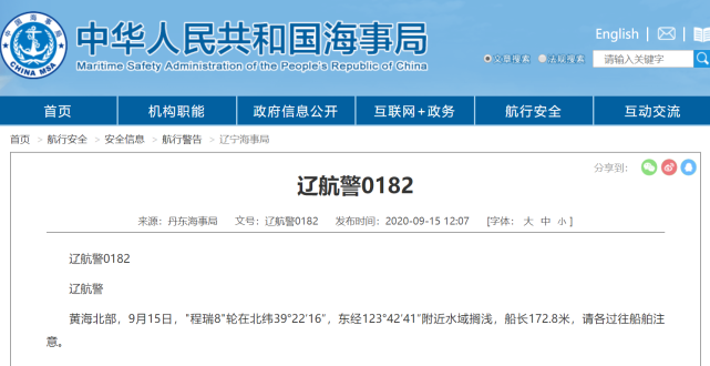 丹东海事局15日发布航行警告:辽航警0182,辽航警,黄海北部,9月15日,「程瑞8」轮在北纬39°22′16″,东经123°42′41″附近水域搁浅,船长172.8米,请各过往船舶注意。