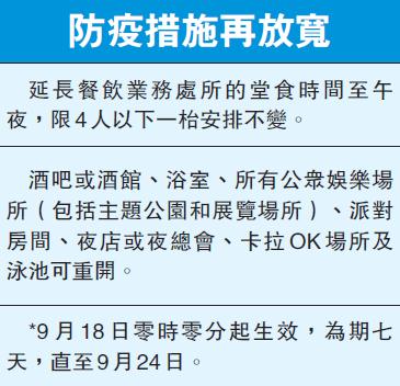 自7月初第三波疫情爆發以來,本港昨日首次錄得本地零確診,僅得4宗輸入個案。行政長官林鄭月娥期望,隨着第三波疫情受控,市民可恢復生活,學生下星期可如期上課,各項活動亦可恢復,在航空、酒店及旅遊等方面,當局亦會爭取適當有序通關。本周五起,本港酒吧、派對房間、卡拉OK、泳池及主題公園等可重開;食肆晚市堂食可延長至午夜,維持最多4人一枱;而4人限聚令及公眾地方須戴口罩的規定則繼續維持。