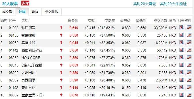今日二十大股票升幅榜中,珠江鋼管(1938)以212.8%的升幅居冠,股價一度漲逾300%,截至13時50分,報0.61港元,市值6.27億港元。