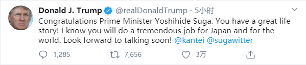 当地时间17日,美国总统特朗普发推祝贺日本新首相菅义伟就任,「祝贺菅义伟首相,你的人生经历很精彩!我知道你将会为日本与世界作出巨大的贡献,很期待在不久的将来与你交谈!」
