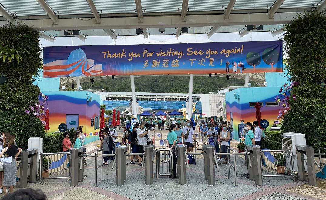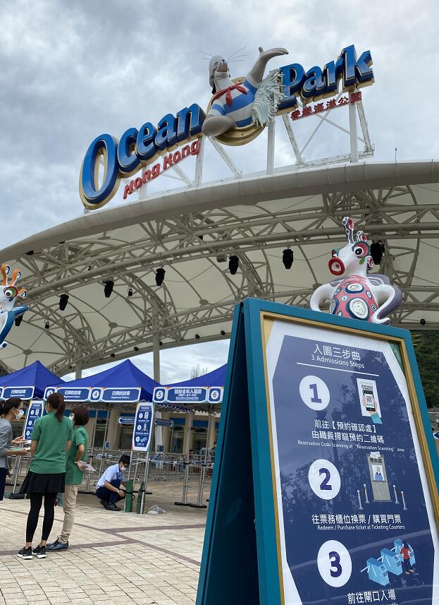 第三波疫情持續緩和,多類處所可有條件重開。海洋公園自7月中經過逾兩個月的休園後,至18日第二度重開,雖然天氣驟晴驟雨,但仍有約百名市民一早站在門口排隊等候入場,園方向首百名客人送上毛公仔等紀念品,園內充滿歡樂氣氛。
