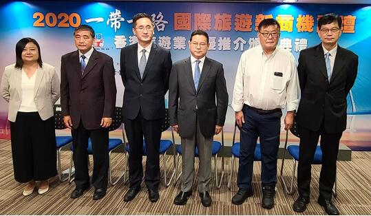 (从左至右:香港旅遊發展局公共事務高級經理李樺,香港商報董事總經理張介岭,商務及經濟發展局副局長陳百里博士,中聯辦宣傳文體部副部長張國義,經濟導報副總經理沈紹基,香港理工大學酒店及旅遊業管理學院副教授麥磊明博士)