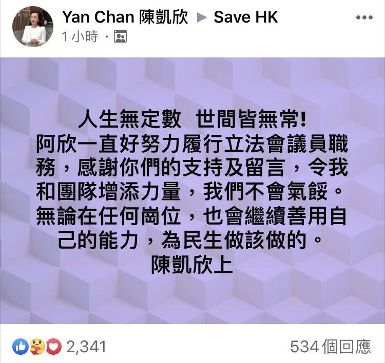 陈凯欣在社交媒体也进行了回应:「阿欣一直好努力履行立法会议员职务,感谢支持及留言,令我和围隧增添力量,我们不会气馁。无论在任何岗位,也会继续善用自己的能力,为民生做该做的。」