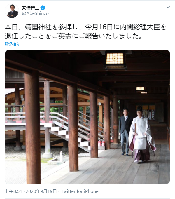 日本已卸任首相安倍晋三在推特上称,19日当天自己前往「靖国神社」参拜,向「英灵报告了自己16日退任首相的事」。