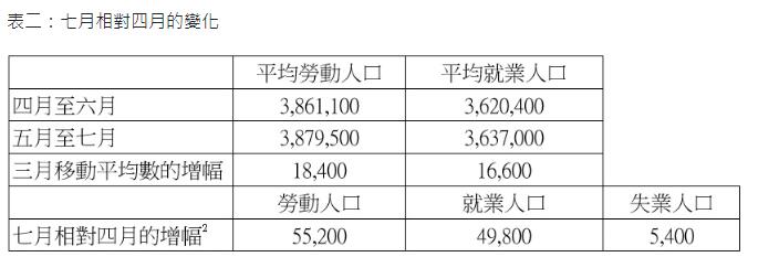 從表二所見,由四月至七月,香港的勞動人口增加了5.52萬人,而就業人口增加了4.98萬人。換言之,七月相對四月的失業人口便增加了5,400人。在這段期間,由於勞動人口增加較就業人口增加快,所以除了失業人口增加,未經季節調整的失業率都會增加。由於絕大部分的大專及中學畢業生若進入勞工巿場,都會是在五至七月之間,所以上述現象令七、八月的失業人口上升,差不多每年都會發生。