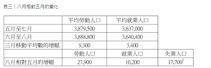 比較表二和表三,八月份勞動人口增加已放緩,而就業人口增加更放慢,而失業人口增加便更快。這亦反映了在香港七、八月的疫情相對四、五月的疫情更嚴峻。