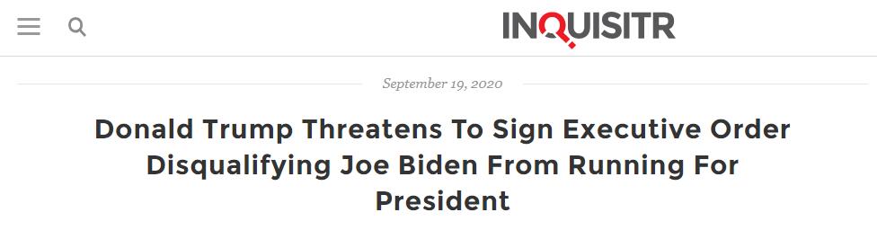 据美国The Inquisitr网站报道,美國總統特朗普在北卡羅來納州出席競選活動時,揚言自己可能會簽署行政命令取消拜登的竞选资格,令民主黨總統候選人拜登不能擔任總統;他再次评价拜登是「最愚蠢和最差的候選人」。