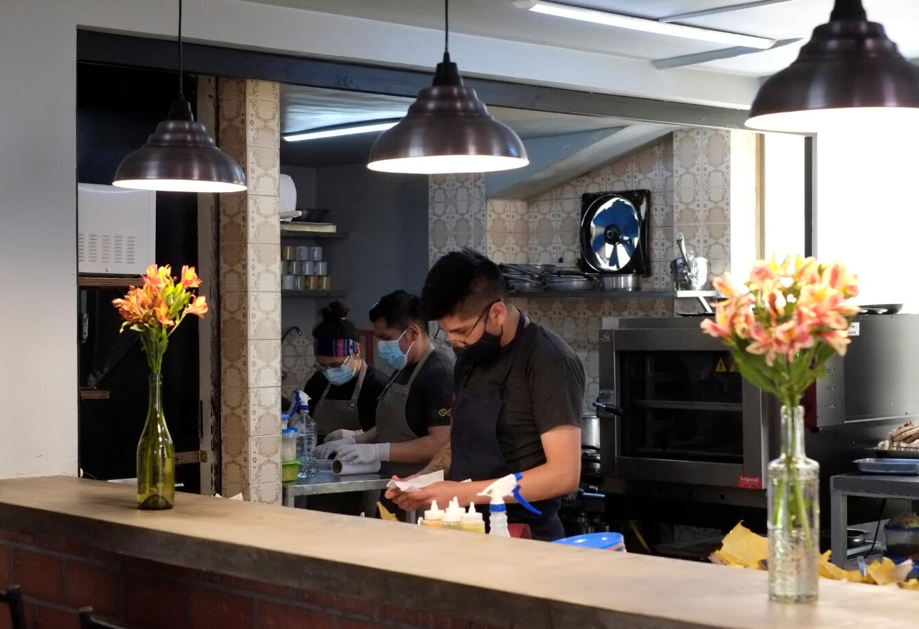 在玻利维亚拉巴斯,当局正在解除对新冠病毒(COVID-19)的封锁,在饭馆重开的第一天厨房工作人员正在备餐。路透社