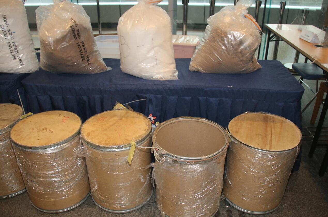 探員在單位內檢獲約130公斤粉末,當中約100公斤含有懷疑毒品氯胺酮成分,相信粉末經提煉後可製成約50公斤氯胺酮,市值約2300萬元。該批粉末呈半製成品狀態,相信要經過加工提煉才可製成毒品。