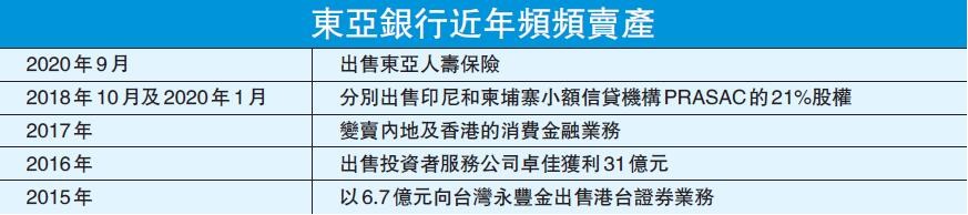 東亞近年先後多次出售非核心資產及部分舖位,包括2015年以6.7億元向台灣永豐金出售港台證券業務;2016年出售投資者服務公司卓佳獲利31億元;2017年變賣內地及香港的消費金融業務;2018年10月和今年1月分別出售印尼和柬埔寨小額信貸機構PRASAC的21%股權等。