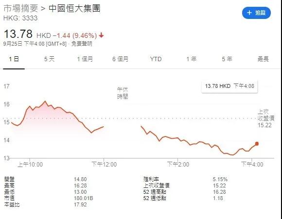 不僅如此,同系的恆大汽車(708)亦失守100天線,沽盤湧現,最低見15.3港元,創逾兩個月低,最終收報16.82港元,挫12.8%。恆大持股的恆騰網絡(136)也急挫19.05%報0.255港元,五連跌。今日集團在上海證交所上市的3隻公司債券價格也因急跌而一度臨時停牌。