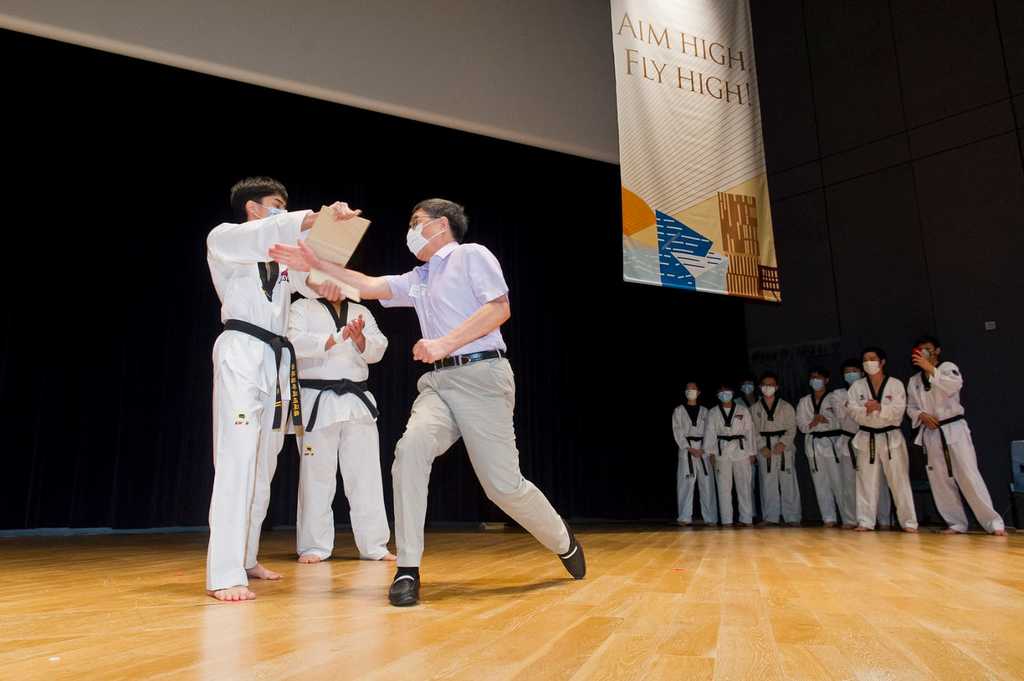 活動邀得城大跆拳道校隊表演,年輕時學過跆拳道的郭位更臨時應邀上台與跆拳道隊互動,表演一記手刀劈木板,搏得全場熱烈掌聲。