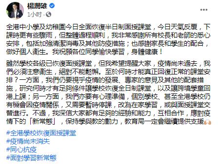 全港學校繼上周三第一階段恢復面授課堂後,今日(29日)中二至中四、小二至小四、幼稚園低班及幼兒班,都開始全面恢復面授課程。教育局長楊潤雄今日(29日)在社交網站表示,仍要視乎疫情發展、專家意見和配套措施,研究何時有足夠條件,讓學校恢復全日制課堂,以及讓跨境學童回港上課。