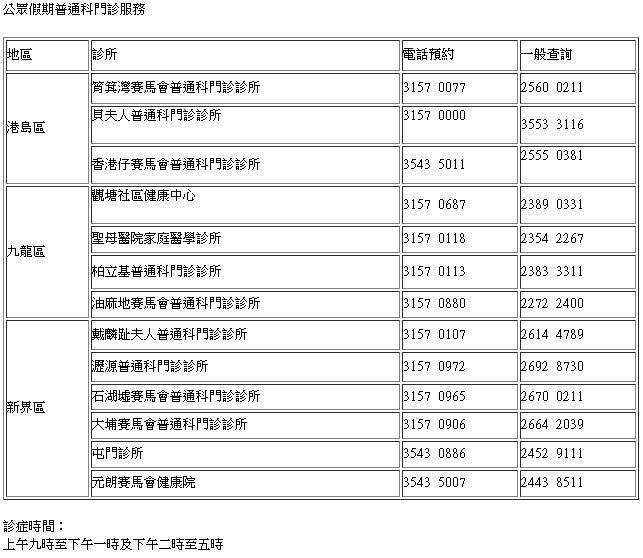 醫管局稱,轄下其中13間普通科門診診所將於國慶日(10月1日)及中秋節翌日(10月2日)假期提供服務;求診人士可如平日般以電話或透過「HA Go」手機程式內的「預約普通科門診」功能,預約診症時間。公立醫院急症室在假期期間會如常提供服務,照顧有緊急醫療需要的病人。診症時間由上午9時至下午1時及下午2時至5時。