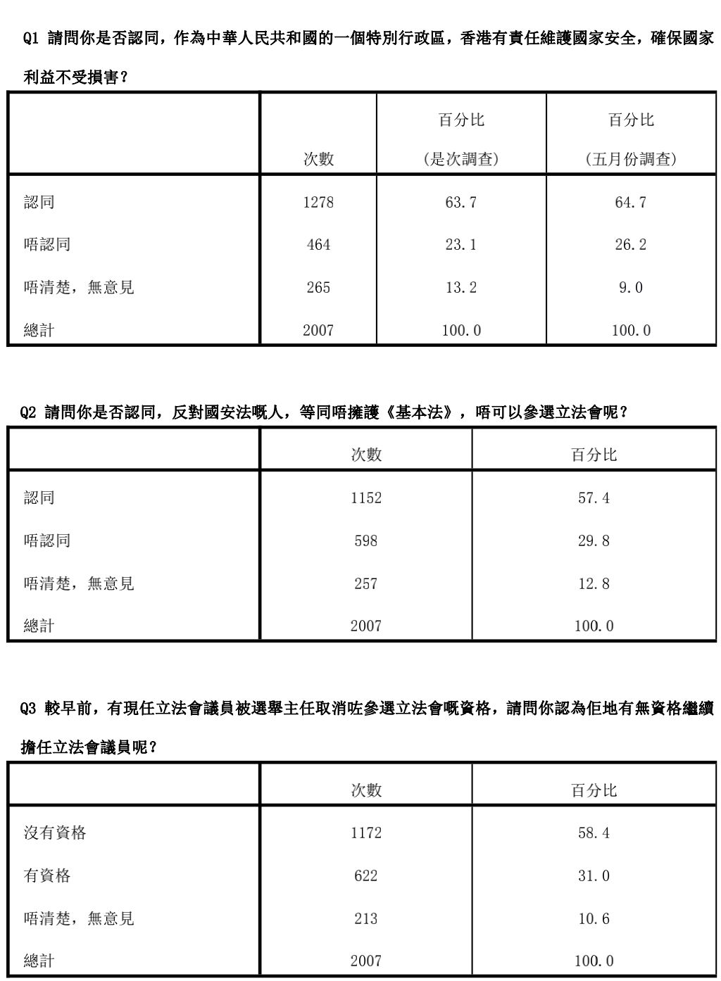 為了解市民對反對派立法會議員去留的意向,紫荊研究院委託香港社會科學民意調查中心成功訪問2007名市民,結果發現58.4%受訪者認為在7月立法會選舉提名期時,被選舉主任取消參選資格的多名參選人,沒有資格繼續擔任議員。另有57.4%受訪者認為反對香港國安法的人士,亦不應具備參選立法會的資格。紫荊研究院呼籲各方應落實全國人大常委會決定精神,確保本屆立法會在未來一年繼續履行法定職責,為香港市民服務。