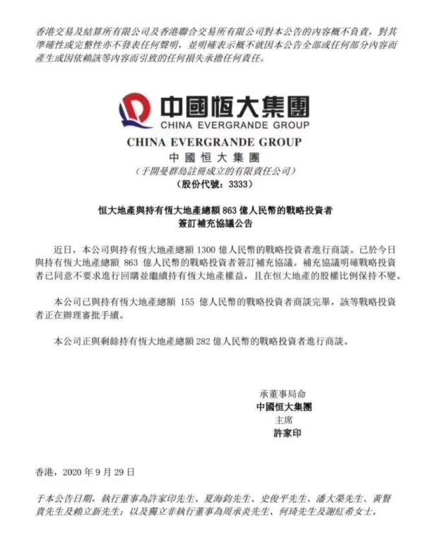 今日與其中持有恒大地產總額863億人民幣的戰略投資者簽訂補充協議,戰略投資者已同意不要求進行回購並繼續持有恒大地產權益,且在恒大地產的股權比例保持不變。已與持有恒大地產總額155億人民幣的戰略投資者商談完畢,正在辦理審批手續。與剩餘持有恒大地產總額282億的戰略投資者正在進行商談。
