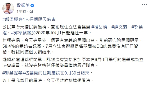 今日(29日),对於公民黨借民調過橋,宣布現任立法會議員楊岳橋、譚文豪、郭榮鏗、郭家麒將於2020年10月1日起延任一年一事,梁振英在FB上发文直指郭榮鏗等4名議員的任期應該在9月30日結束。