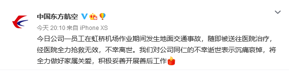東航在回應中稱,今日公司一員工在虹橋機場作業期間,發生地面交通事故,隨即被送往醫院治療。經醫院全力搶救無效,不幸離世。我們對公司同仁的不幸逝世表示沉痛哀悼,將全力做好家屬關愛,積極妥善開展善後工作。
