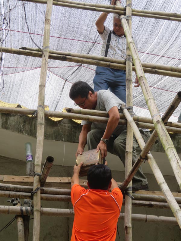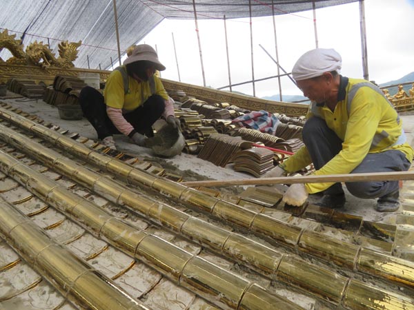 協天宮的重修工程還要進行年多兩年才完成,現在頂部正鋪金瓦,工人說已鋪了個多星期,估計3周內鋪完,共鋪6000多塊。(記者 鄭玉君)