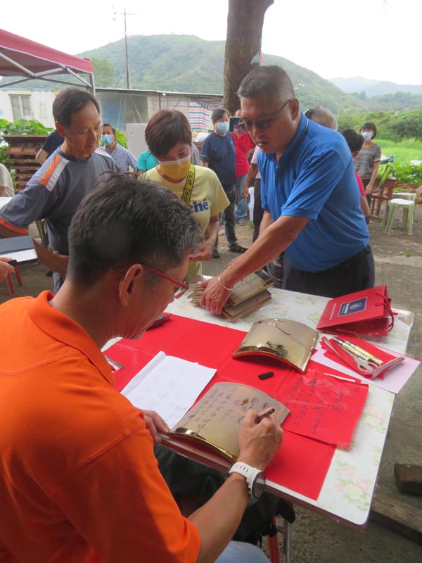 南涌村代表與嘉賓在協天宮前合照,左三是沙頭角區鄉事委員會主席李冠洪,左二為南涌居民代表鄭光明。記者鄭玉君攝