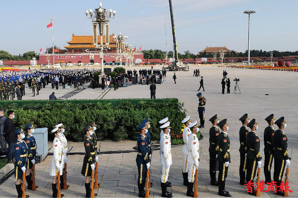 方陣前,以中共中央,全國人大常委會,國務院,全國政協,中央軍委,各民主黨派、全國工商聯和無黨派愛國人士,各人民團體和各界群眾,老戰士、老同志和烈士親屬,中國少年先鋒隊名義敬獻的9個大型花籃一字排開。花籃的紅色緞帶上寫着「人民英雄永垂不朽」。