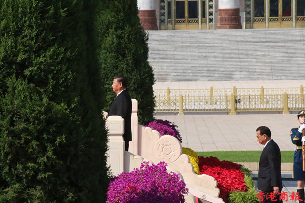 習近平邁步上前,仔細整理花籃緞帶。隨後,習近平等黨和國家領導人緩步繞行,瞻仰人民英雄紀念碑。
