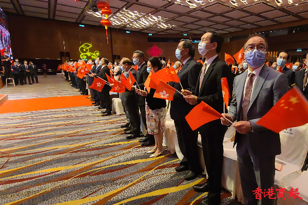 在會上,現場人士手持國旗與區旗揮舞,與台上表演者共唱歌曲《東方之珠》。(记者 木子)