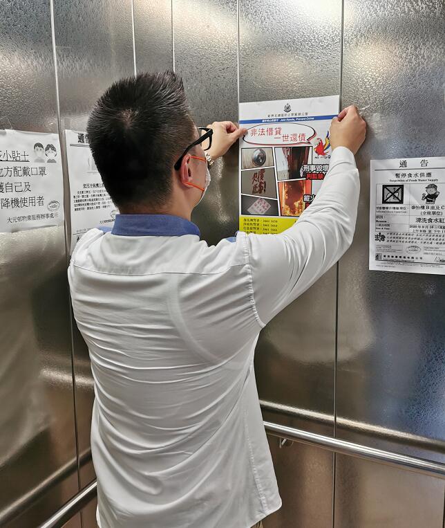 警務人員於屋邨升降機內張貼宣傳海報,呼籲住戶舉報非法收債行為。