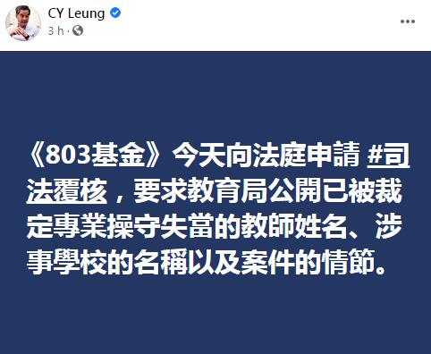 全國政協副主席、前行政長官梁振英今日(30日)在社交網站表示,《803基金》已向法庭申請司法覆核,要求教育局公開已被裁定專業操守失當的教師姓名、涉事學校的名稱以及案件的情節。