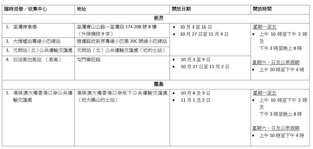 計劃會提供兩輪檢測,每輪為期兩星期。第1輪由10月3至16日、第2輪由10月27日至11月9日,署方會於全港設立14個臨時檢測套裝派發/收集中心。的士及公共小巴司機可前往指定臨時檢測套裝派發中心,出示有效的士或公共小巴司機證,以索取檢測套裝。司機須於政府網頁(www.tgptest.gov.hk) 登記個人資料,並在自行採集深喉唾液樣本當日內,將樣本交回指定臨時收集中心。檢測屬自願性質,費用全免。