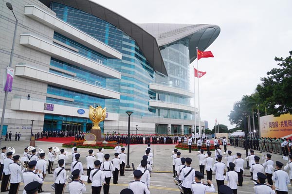 行政長官林鄭月娥及多名政府官員出席儀式。現場放置一幅印有「同發展,共繁榮」的大型展板,廣場外圍一帶保安加強,防暴警察在會場外駐守,會展對開的博覽道、龍和道等都有封路。當局日前表示,考慮到新冠肺炎風險,今年升旗儀式不設公眾觀禮區。