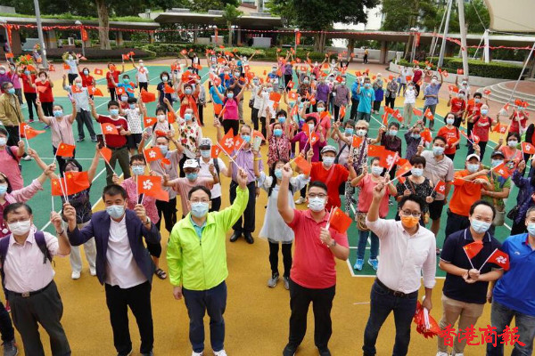今日是國慶日,香港各界慶典委員會在多區舉辦國慶升旗儀式,早上近8時,在藍田邨藍蔚樓旁的廣場已有數十名市民,扶老攜幼,準備觀看升旗儀式。他們4人一組手持國旗及區旗,懷著興奮心情等待國旗升起。