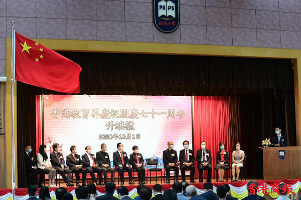 香港教育界慶祝中華人民共和國成立71周年升旗禮1日早上在培僑小學舉行。中聯辦副主任譚鐵牛應邀出席主禮,教育局局長楊潤雄、教育界慶祝國慶籌委會執行主席胡艷芬分別致辭,教聯會主席黃錦良、立法會前主席曾鈺成等以及近200名師生參加活動。