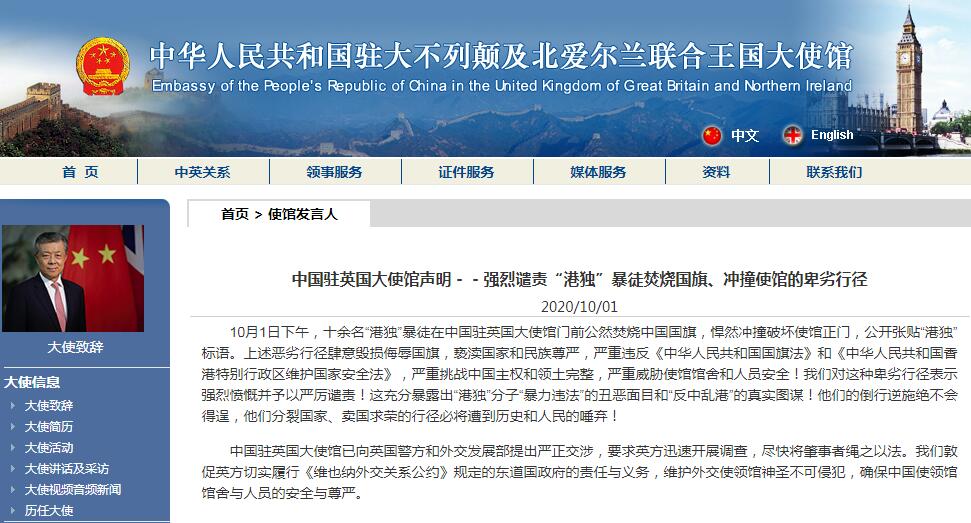声明指出,10月1日下午,十餘名「港独」暴徒在中国驻英国大使馆门前公然焚烧中国国旗,悍然衝撞破坏使馆正门,公开张贴「港独」标语。上述恶劣行径肆意毁损侮辱国旗,亵渎国家和民族尊严,严重违反《中华人民共和国国旗法》和《中华人民共和国香港特别行政区维护国家安全法》,严重挑战中国主权和领土完整,严重威胁使馆馆舍和人员安全!我们对这种卑劣行径表示强烈愤慨并予以严厉谴责!这充分暴露出「港独」分子暴力违法的丑恶面目和「反中乱港」的真实图谋!他们的倒行逆施绝不会得逞,他们分裂国家、卖国求荣的行径必将遭到历史和人民的唾弃!