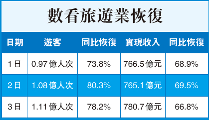 據文旅部昨日披露,綜合各地文化和旅遊部門、通訊運營商、線上旅行服務商的數據,經中國旅遊研究院(文化和旅遊部數據中心)綜合測算,10月1日至4日,共接待遊客4.25億人次,實現旅遊收入3120.2億元。其中,長假前三天(10月1日至3日),累計接待遊客3.16億人次,同比恢復77.5%;旅遊收入2312.3億元,同比恢復68.4%。