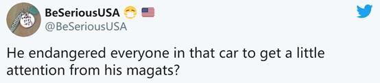 一位名为「BeSeriousUSA」的推特用户也批评称,特朗普让车上所有人「陷入危险之中」,只为了让他的支持者们注意到他。