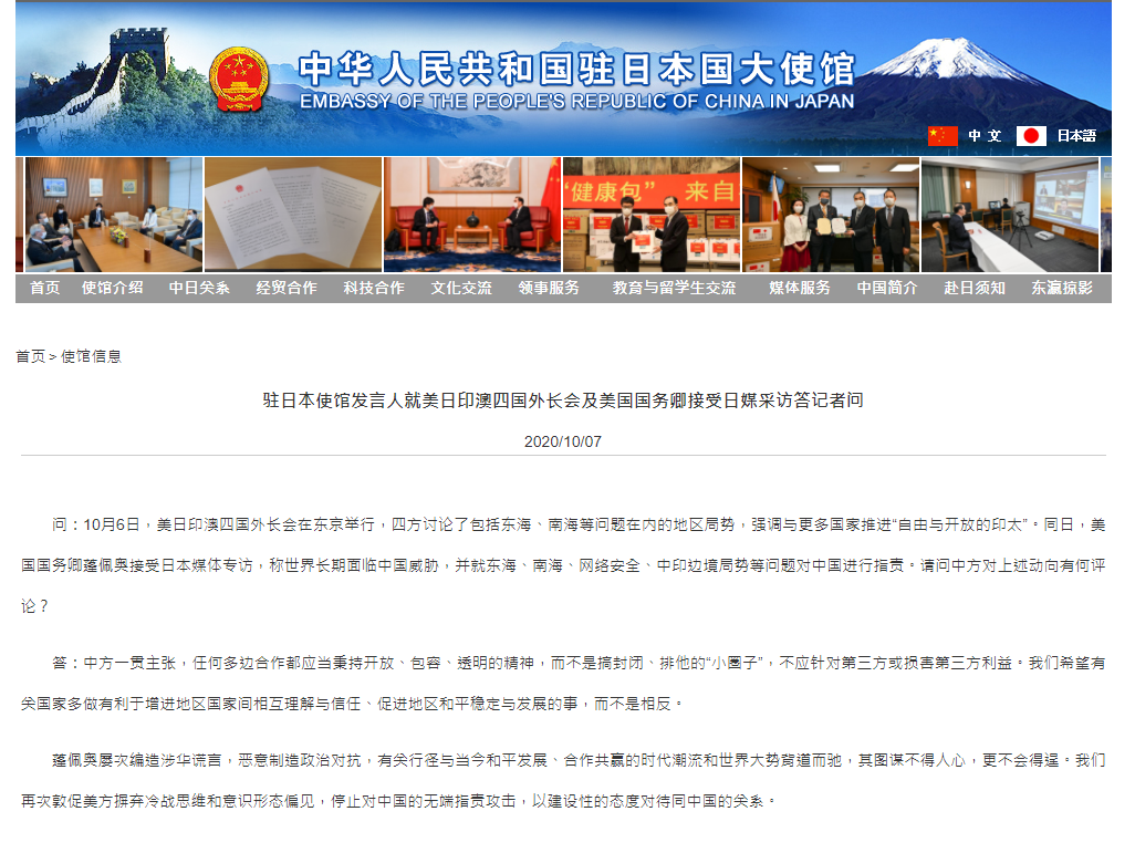中國駐日本大使館還強調,中方一貫主張任何多邊合作,應當秉持開放、包容、透明的精神,而非搞封閉、排他的「小圈子」,不應針對第三方或損害第三方利益。