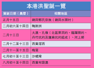根據香港首份非物質文化遺產清單,香港洪聖誕有的在正月,有的在二月,也有七月和八月。附表就是按這份清單梳理而成。