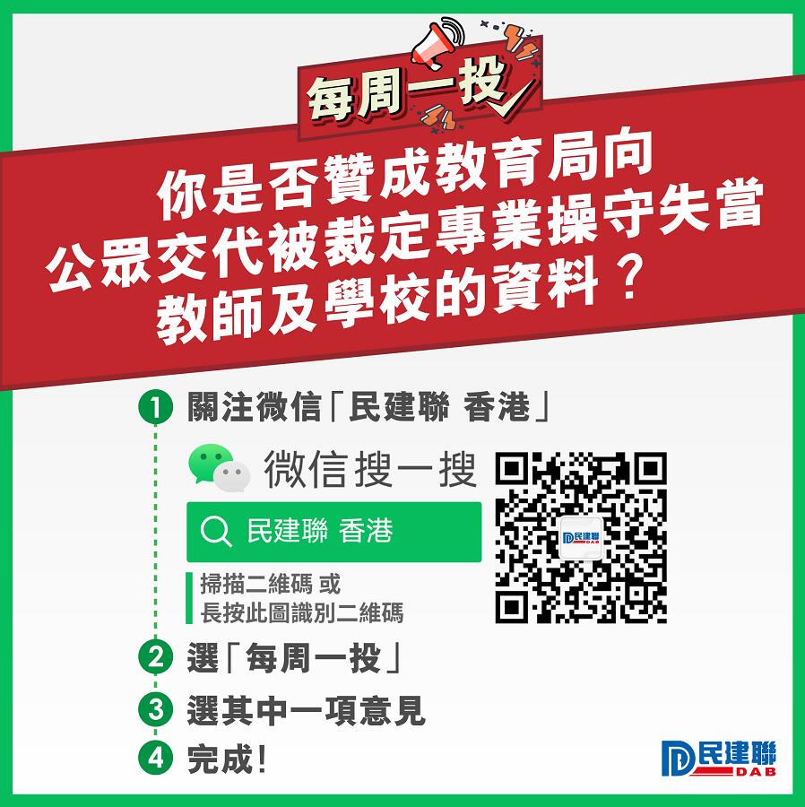 民建聯立法會議員陳恒鑌今日在社交平台表示,民建聯微信公眾號現正就教育局應否向公眾交代被裁定專業操守失當教師及學校的資料進行投票。市民可以立即關注民建聯微信公眾號,並到「每周一投」版面投票,表達自己的意見。(记者唐信恒)