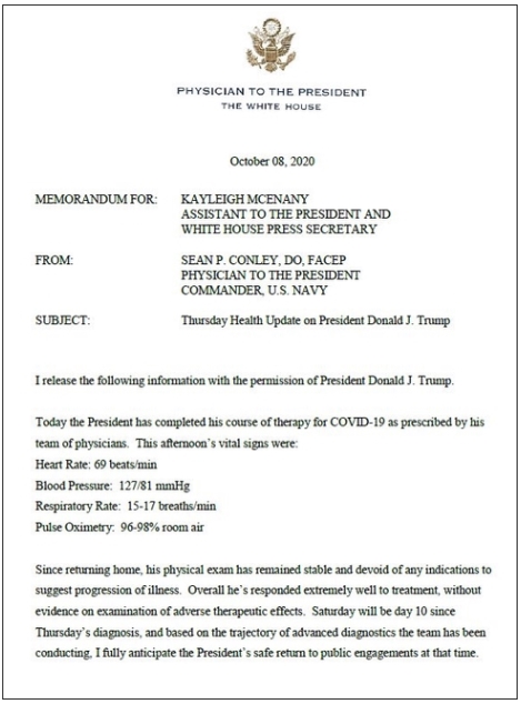 美國白宮醫生指確診感染新型冠狀病毒的總統特朗普已經完成療程,對治療反應良好。白宮公開醫生康利的備忘,寫上特朗普已經完成白宮醫療團隊制訂的療程,情況維持穩定,無任何惡化跡象。星期六將會是特朗普確診第10日,康利預期當日特朗普可以安全再次出席公眾場合。