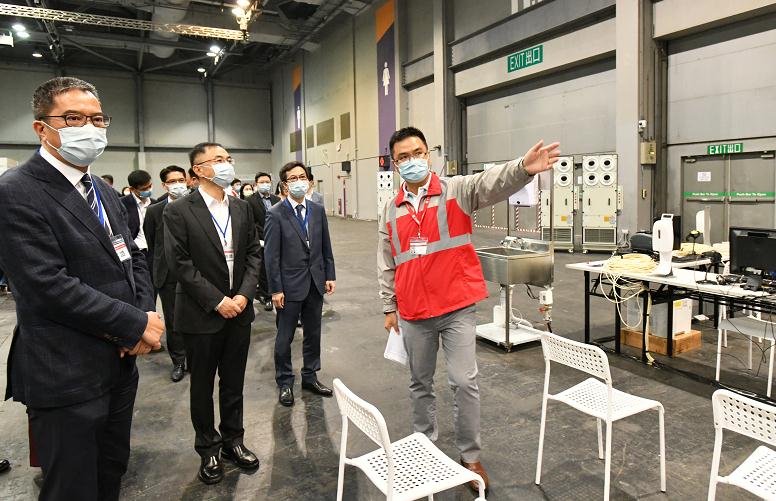 發展局局長黃偉綸(左一)及深圳市建築工務署副署長李卓(左二)9日視察設置於亞洲國際博覽館增建社區治療設施內的醫療站。