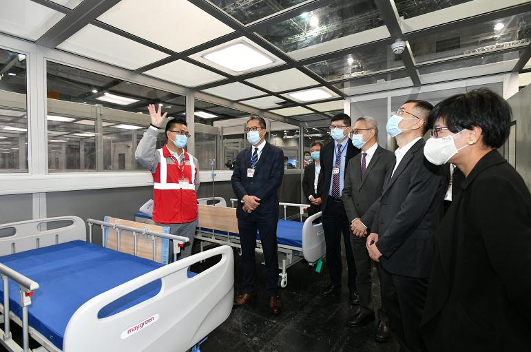 發展局局長黃偉綸(左二)、食物及衛生局副局長徐德義(右三)、醫院管理局行政總裁高拔陞(左三)、建築署署長林余家慧(右一)及深圳市建築工務署副署長李卓(右二)9日視察亞洲國際博覽館增建社區治療設施內的負氣壓病房。