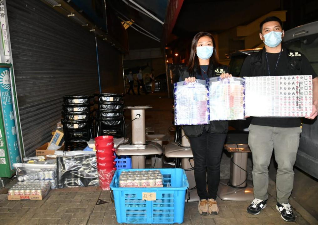 另外,今日凌晨約零時,新界南總區反黑組亦在荃灣柴灣角街95號一單位,搗破懷疑無牌酒吧,檢獲約400支總值約2.5萬元的酒類飲品、約2300元現金。1名52歲本地男負責人及1名48歲外籍女負責人,涉嫌「無牌售賣酒類飲品」;被捕及違反禁令營業;6男6女(28至36歲)外籍人士,則涉嫌「在無領取牌照的地方飲酒」被捕及違反「限聚令」被票控,其中5男3女亦涉「非法入境」。