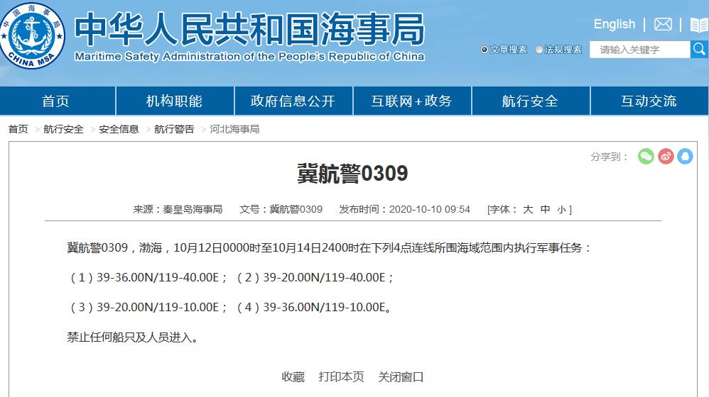 冀航警0309,渤海,10月12日0000时至10月14日2400时在下列4点连线所围海域範围内执行军事任务: