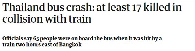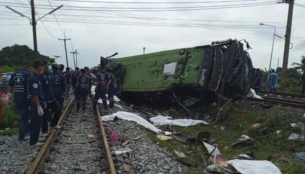 据外媒报道,当地时间11日8时左右,泰國一架載有65人的旅遊巴橫過火車軌時,被駛至的火車撞到,最少17人死亡,30人受傷。事發在距離曼谷80公里的差春騷府,旅遊巴被撞後翻側,有傷者被拋出車外。