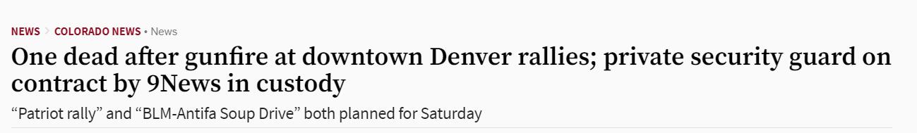 據報道,這起槍擊事件發生在丹佛藝術博物館附近。當時,持極右與極左觀點的活動人士正在附近舉行集會。据目击者,一名极右组织成员试图用胡椒喷雾袭击另一方人员,随后遭到对方持枪反击。警方稱,嫌疑人是一名私人保安,「與反種族主義組織『安提法』(ANTIFA)沒有關聯」。