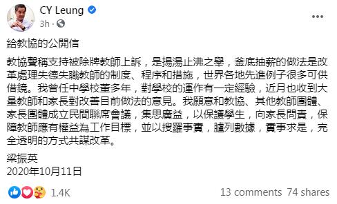 教協指會協助一名被除牌小學教師上訴,該教師早前被指教学中有計劃地散播「港獨」;该教师因嚴重專業失德被教育局除牌。梁振英指教協的做法是揚湯止沸,指改革處理失德失職教師的制度、程序和措施才是釜底抽薪的做法。