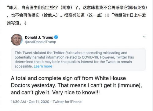 「這條推文違反了推特關於傳播與新冠病毒相關的誤導性和潛在有害信息的規定。然而,推特也已決定,保留這條推文可能符合公眾利益。」