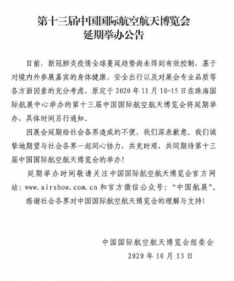 据中国国际航空航天博览会组委会10月13日发布公告,目前,新冠肺炎疫情全球蔓延趋势尚未得到有效控制,基于对境内外参展嘉宾的身体健康、安全出行以及对展会专业品质等各方面因素的充分考虑,原定于2020年11月10-15日在珠海国际航展中心举办的第十三届中国国际航空航天博览会将延期举办,具体时间另行通知。
